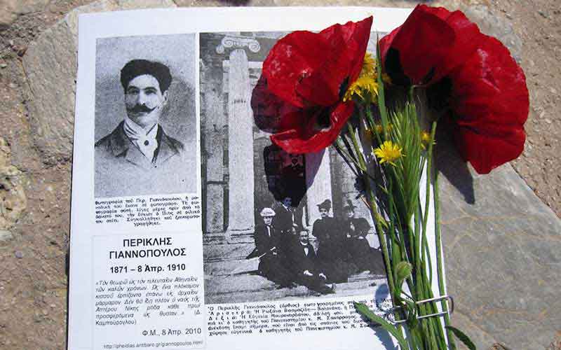 Σαν σήμερα Μεγάλη Πέμπτη του 1910, ο Περικλής Γιαννόπουλος δημιούργησε καί εκτέλεσε τό τελευταίο έργο του -κατά πολλούς τό αποκορύφωμα τού έργου του. Όπως είχε προσχεδιάσει μέ κάθε λεπτομέρεια πολύ καιρό πρίν, στεφανωμένος, γυμνός, καβάλησε τό άσπρο άλογό του καί μπήκε μαζί του στήν θάλασσα τού Σκαραμαγκά. Μέ μία σφαίρα στό κεφάλι, ενώθηκε γιά πάντα μέ τήν ελληνική φύσι πού τόσο είχε αγαπήσει. Προηγουμένως είχε κάψει πολλά ανέκδοτα έργα του (κατά μαρτυρίες μιά ολοκληρωμένη εργασία περί αρχιτεκτονικής, καθώς καί διηγήματα φαντασίας), λέγοντας ότι αφού η Ελληνική Φύσις τά ενέπνευσε στόν ίδιο, θά τά ενέπνεε καί σέ άλλους στό μέλλον. Τό νεκρό σώμα του τό έβγαλαν τά κύματα στήν στεριά δέκα μέρες μετά. Πρίν ταφεί, δύο άγνωστες κυρίες, σάν νύμφες τής Αττικής γής, στόλισαν τόν νεκρό μέ λουλούδια (όπως έγινε πολύ αργότερα γνωστό, ήταν η Σοφία Λασκαρίδου).