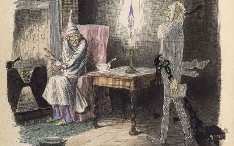 Για αυτόν τα Χριστούγεννα είναι ένα ενοχλητικό διάστημα στο οποίο κανείς δεν εργάζεται και δεν μπορεί να κερδίσει χρήματα, ενώ το ρεπό εξαρτάται για τους εργαζόμενους. Τα πάρτι, τα δώρα και οι χαιρετισμοί δεν είναι παρά ανοησίες, το επαναλαμβάνει στον ανιψιό του ενώ ο γραφέας του, ο καημένος ο Bob Cratchit, εργάζεται μέσα στην ψύχρα με πενιχρές αμοιβές. Όμως κάτι συμβαίνει την παραμονή των Χριστουγέννων, όπου τον Scrooge επισκέπτεται το πνεύμα του παλιού του συντρόφου, του Jacob Marley, ο οποίος πέθανε το ίδιο βράδυ επτά χρόνια νωρίτερα. Ένας άλλος μίζερος μοναχικός, που παρουσιάζεται να σέρνει μια μεγάλη αλυσίδα δεμένη στη μέση, τυλιγμένη γύρω από το σώμα, φτιαγμένη από κουμπαράδες, κλειδιά, λουκέτα, λογιστικά βιβλία, συμβολαιογραφικές πράξεις και βαριά ατσάλινα πορτοφόλια. Ο Marley, όπως ο καταραμένος του Δάντη, καταδικάζεται στην ποινή της ανταπόδοσης, πρέπει να περιπλανιέται για την αιωνιότητα σέρνοντας την αλυσίδα. Τρέμοντας, ο Scrooge ρωτάει το γιατί και παίρνει την απάντηση του: «Σέρνω την αλυσίδα που σφυρηλάτησα όταν ήμουν ζωντανός. Την έφτιαξα μόνος μου, δαχτυλίδι με δαχτυλίδι, κομμάτι-κομμάτι. Εγώ ο ίδιος την φόρεσα με τη θέλησή μου και τώρα την φοράω ως καρπό των επιλογών μου».