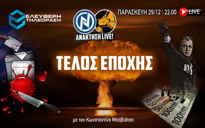 Εκπομπέςπρώτη σελίδαΑπόψε στις 22:00 στην εκπομπή ΑΝΑΚΤΗΣΗ LIVE: Τέλος εποχής… Εγκλήματα, πολιτική, ποδόσφαιρο 29/12/2023 Απόψε στις 22:00 με τον Κωνσταντίνο Μποβιάτσο… Τέλος εποχής… Εγκλήματα, πολιτική, ποδόσφαιρο.